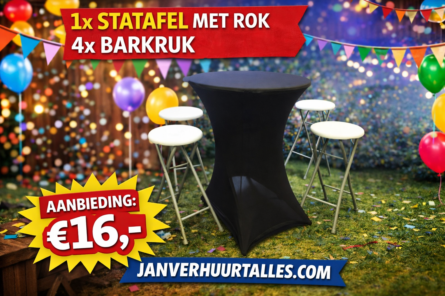 Het goedkoopste combipakket van Jan verhuurt alles. Een handige statafel met luxe zwarte rok. En 4 barkrukken.